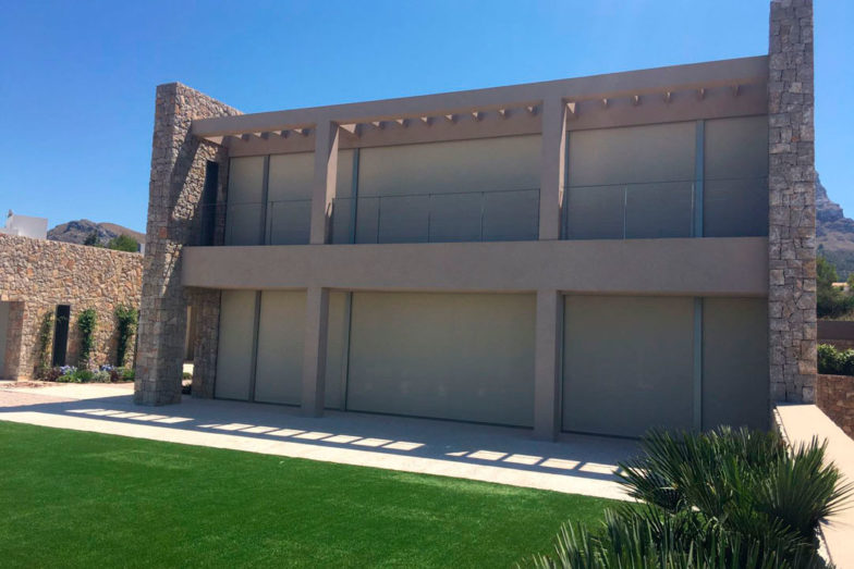 Las cortinas Renson Fixscreen permiten anchos muy superiores a otras soluciones de oscurecimiento (como persianas o celosías) pudiendo llegar hasta los 6 metros de ancho. Existen soluciones constructivas de todo tipo según los requisitos de cada proyecto y se puede empotrar totalmente cajón y guías de forma que cuando la cortina esté subida sea totalmente invisible.