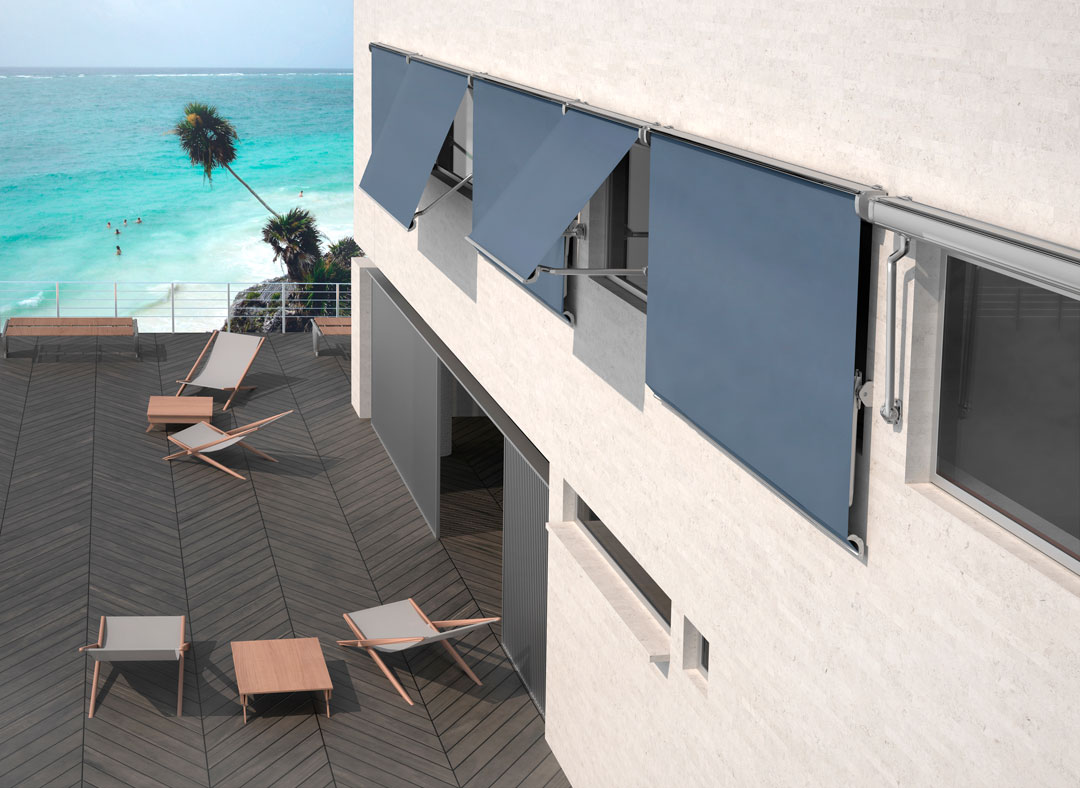 Los toldos punto recto markilux están especialmente indicados para ventanas por la posibilidad de variar su inclinación con una fuerte pendiente para proteger completamente la ventana de la incidencia del sol. Los brazos incorporan un sistema de tensión para ofrecer resistencia al viento. Se diferencian de los toldos verticales en que tienen brazos laterales en lugar de guías.